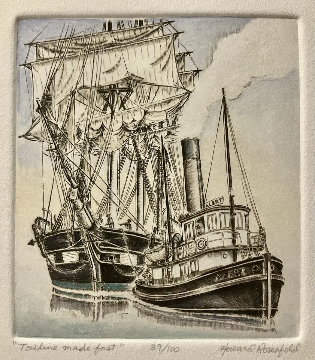 I began doing scrimshaw, a sailor's art, while sailing 1968-78. I sailed on many traditional sailing vessels, including a square rigged ship as well as my own 1914 sloop. I switched mediums in1980 to the original method of etching - hand engraving the metal plate. My prints are pulled on an etching press and are sometimes hand colored. Most of my subjects are ships and whales. I did whale research, public health, Peace Corps, was a volunteer fire chief and an elected official. I've also done picture framing and take pride in the presentations of my artwork.