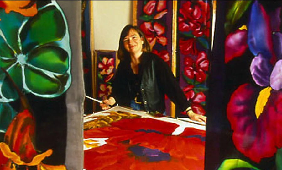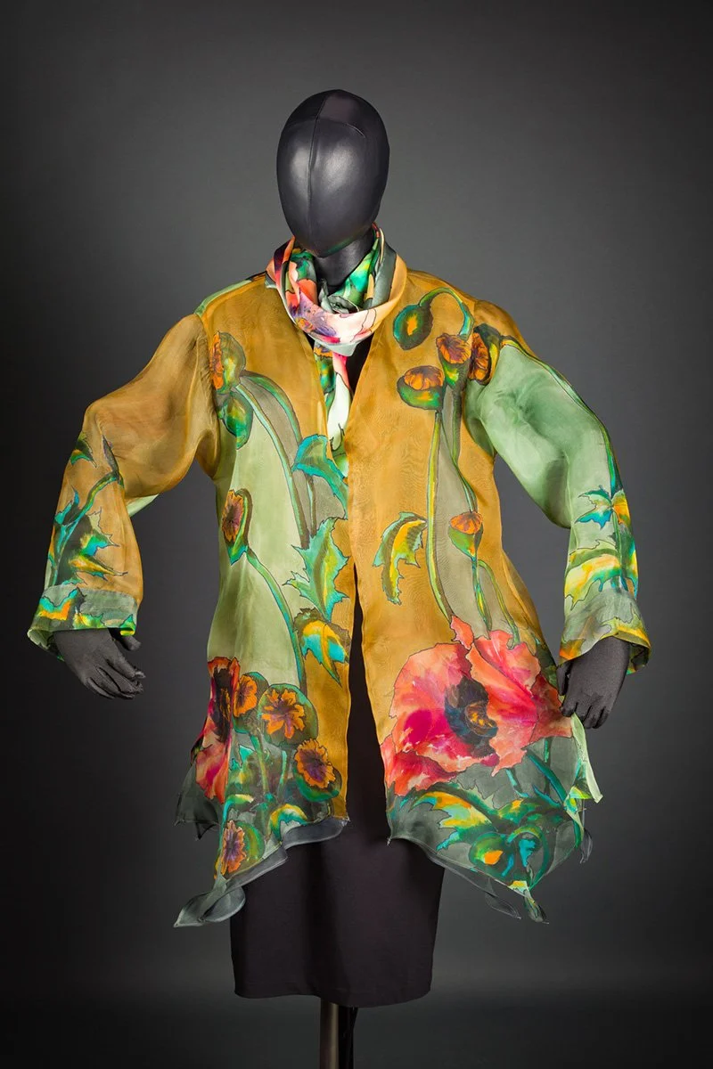 “I stretch the white silk, then draw designs with a resist. I then paint the silk using permanent dyes with a single watercolor brush. Each scarf or garment is an original piece of art. I love my immediate response to the colors and forms that the dyes allow. My art reflects the surrounding island. Layers of light, natural forms, the wild gardens all deeply influence my art.”