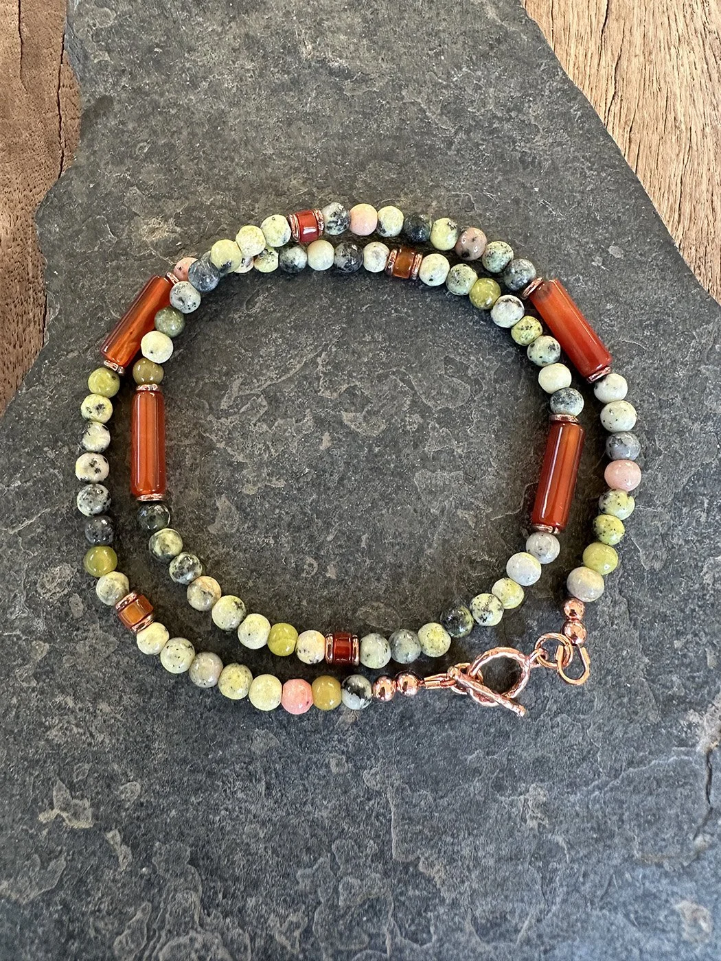 Copper, silver, leather, gemstones, lava, wood